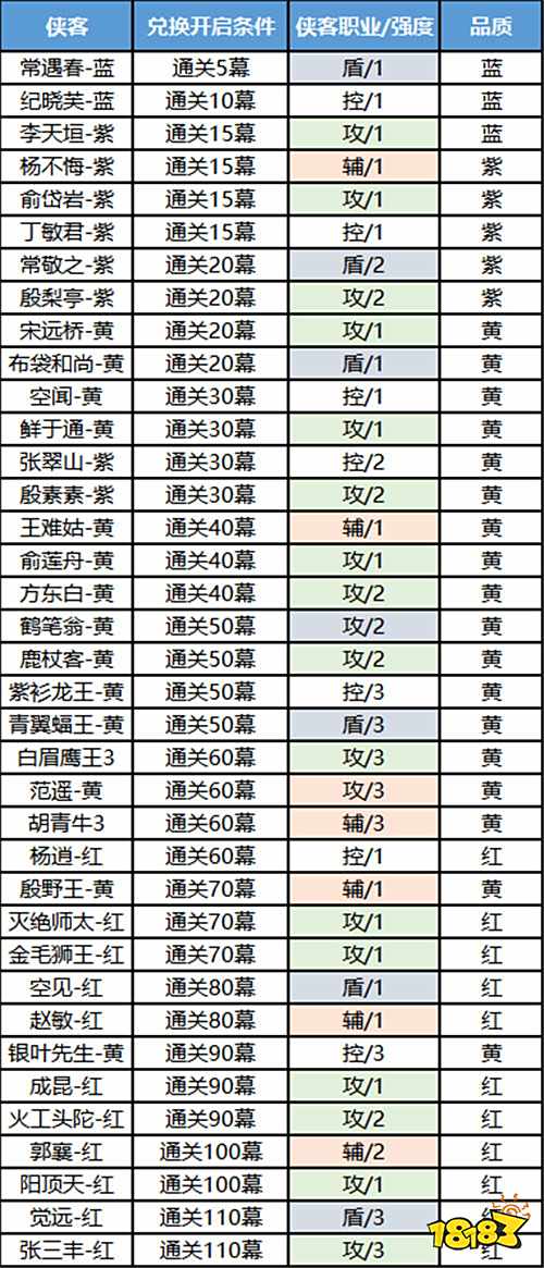 輸出與輔助兼備的列排俠客:與主角、張翠山均有 “遙相呼應” 緣分,激活后增益明顯;技能針對敵方攻擊最高俠客所在列造成傷害,還能降低其 25% 攻擊持續兩回合,既能打輸出又能削弱敵方,前期不可替代。?