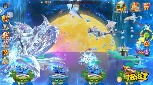 捕魚道具:如冰凍道具凍住魚類,分裂道具使炮彈分裂,加速道具提升發(fā)射速度。
