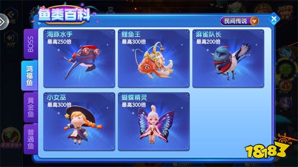 鴻福魚:有海豚水手、鯉魚王、麻雀隊(duì)長(zhǎng)、蝴蝶精靈等。