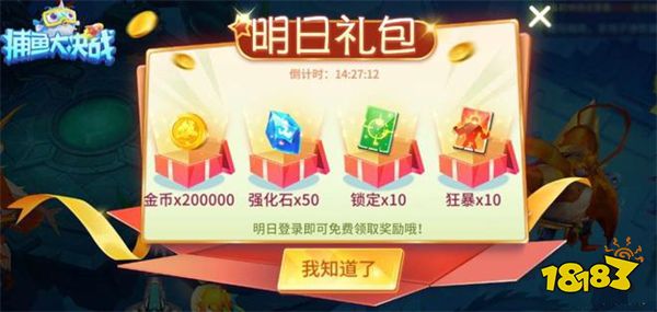 這個(gè)禮包是新手在漁場(chǎng)里升級(jí)到一定炮倍之后就會(huì)有的,沒有任何門檻,只需第二天登錄即可領(lǐng)取,獎(jiǎng)勵(lì)也是很豐厚的,有給金幣、強(qiáng)化石和捕魚道具,捕魚萌新一定不要錯(cuò)過(guò)哦。
