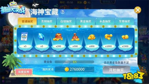 入口位于漁場(chǎng)內(nèi)右側(cè)靠上方。在漁場(chǎng)中擊殺黃金魚之后,金幣獎(jiǎng)勵(lì)的10%將會(huì)放入海神寶藏獎(jiǎng)池,用來(lái)抽獎(jiǎng),檔次越高獎(jiǎng)勵(lì)越多。而海神寶藏的普通檔也是可以抽取到強(qiáng)化石,而且普通檔沒有太大難度,也是新手強(qiáng)化石快速獲取方法之一。