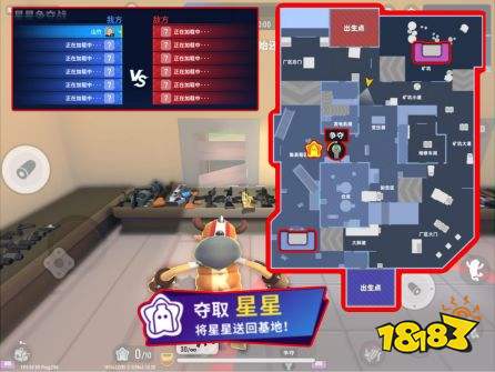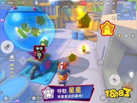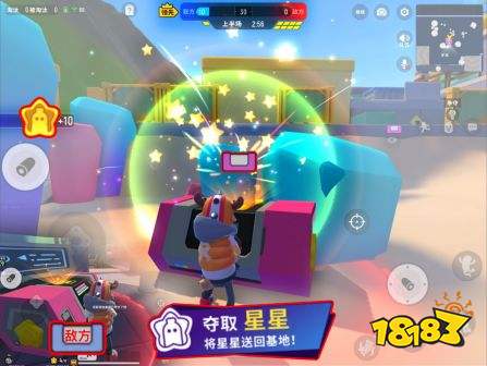 1、玩家分為紅藍兩隊,在特別定制的地圖中進行比賽。地圖的中心會有一個固定時間會產出星星的機器,玩家需要收集并把星星帶回己方基地能源收集箱。