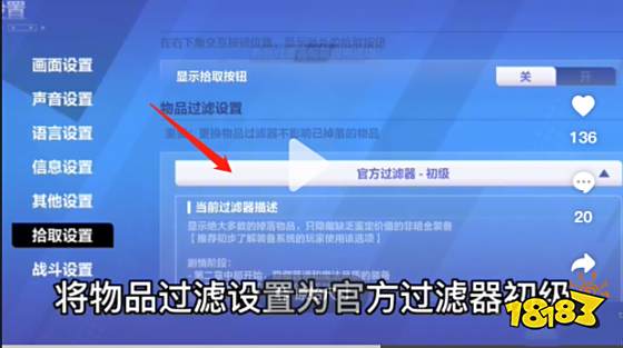 3、點(diǎn)擊進(jìn)入到拾取頁(yè)面后,下拉右側(cè),在里面有一個(gè)【物品過(guò)濾設(shè)置】,這時(shí)候就可以將它修改成為我們想要的裝備等級(jí)了,有初級(jí)、中級(jí)、高級(jí)等。
