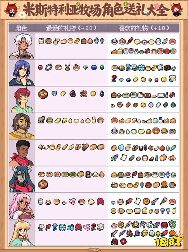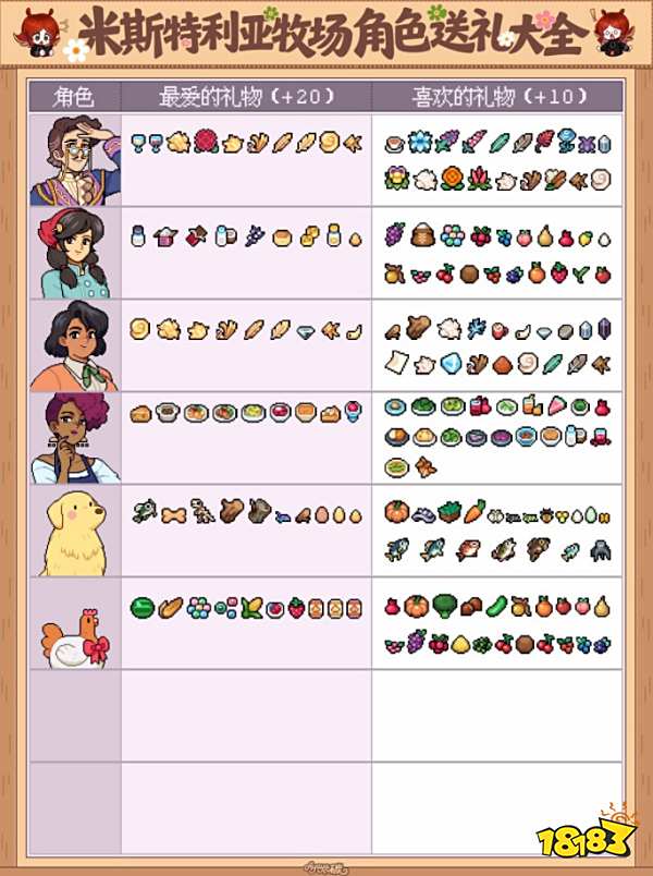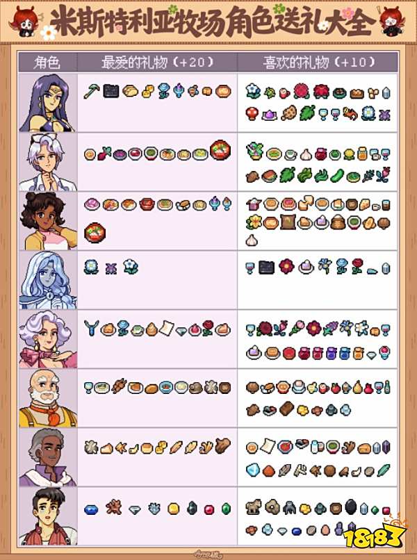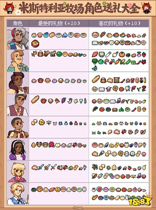米斯特利亞牧場中有多位角色,這些角色都有不同的喜好禮物,在這些喜好禮物間又有最愛與喜歡的區別,很多玩家在游玩的過程中不知道角色分別對應喜歡的禮物是哪些,下面就為大家分享米斯特利亞牧場全角色喜好表。