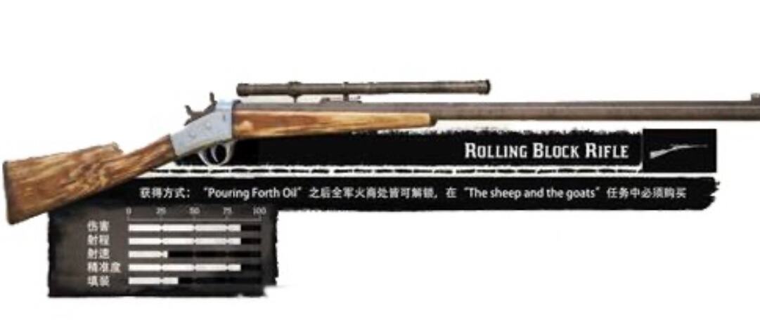 滾輪閉鎖式步槍:完成第二章【火上澆油】任務后可以在武器商人處購買,在第二章“綿羊還是山羊”任務中必須購買。