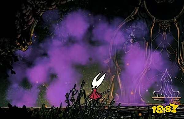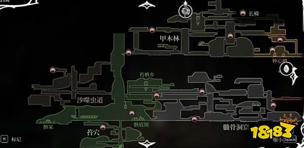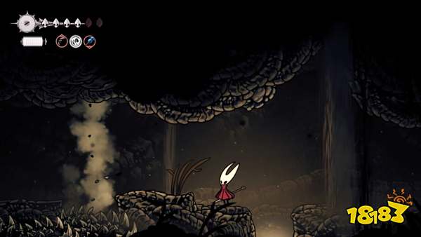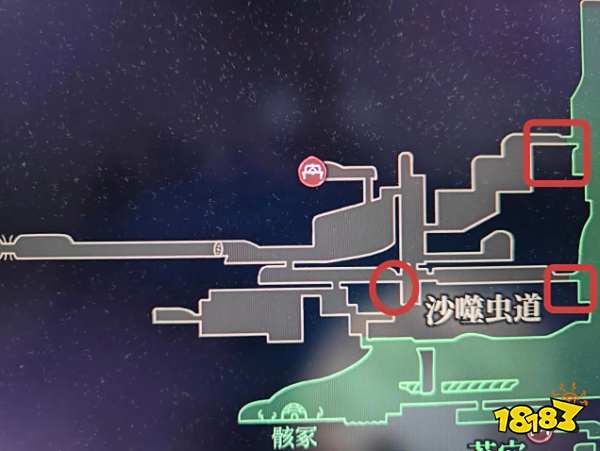 路線2:從骸底鎮出發,坐小鎮左部石電梯往上跳到頂部后往左看有籠子跳跳樂,跳到對面繼續往左走,路上會遇到一只嵌在天花板上往下噴毒液的大蟲子。直接往左沖到盡頭躲一下再進左邊的門就到紅圈處黑門前了。