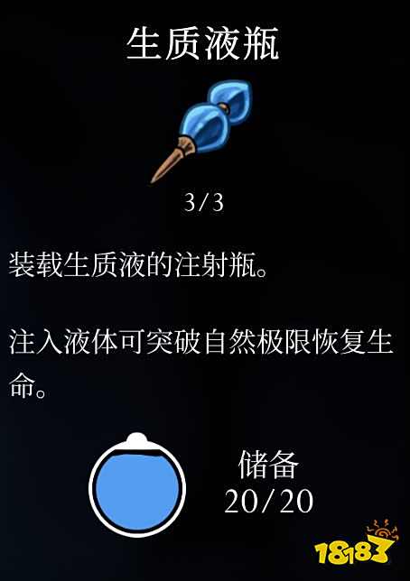 使用后為大黃蜂提供一格一次性的藍血,重復使用藍血可疊加,且藍血坐椅子會消失無法保留。使用一次消耗1儲存量,無工具攜帶量升級時一次可以攜帶三瓶。