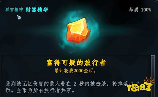 通過擊殺敵人獲得金幣。非常bug的是,由于財富掉落的金幣是全隊共享的,每個人都能吃到收益。所以一個很常見的玩法是,在聯機局中,每個隊友都用Boss掉落的升級道具去優先升級“財富精華”,最后交給AD主力來裝,全員都能持續吃經濟。