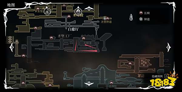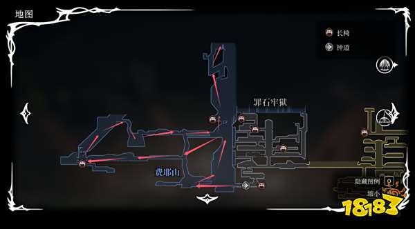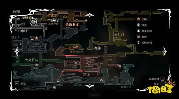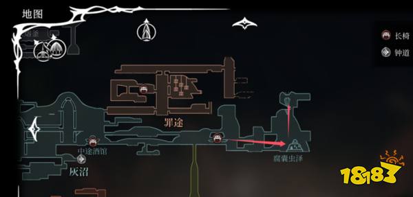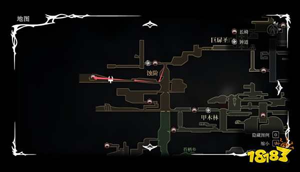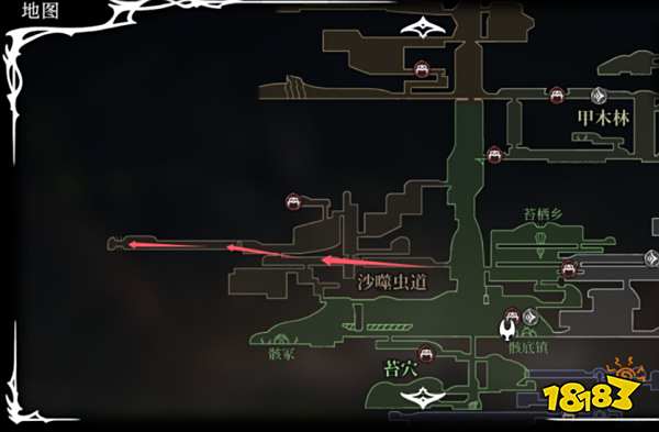 圖十五:獲得格擋(法術),到達罪途地圖最左上位置,有隱藏墻,打破進入后是迷障區域,在這個區域是無限循環的,需要找到白色小蝴蝶(圖十六白色光點),在白色小蝴蝶周圍進行彈琴,它會帶你走出迷障,注意不要跟丟,會重新開始,然后順著路走走,就可以見到boss幽影,打敗boss獲得十字繡,即格擋