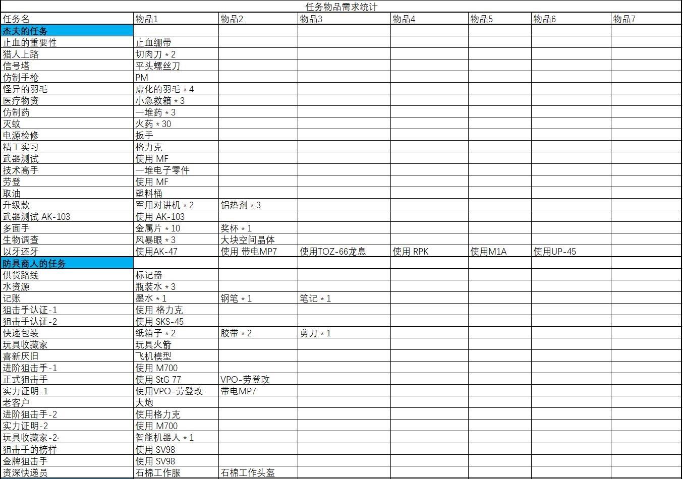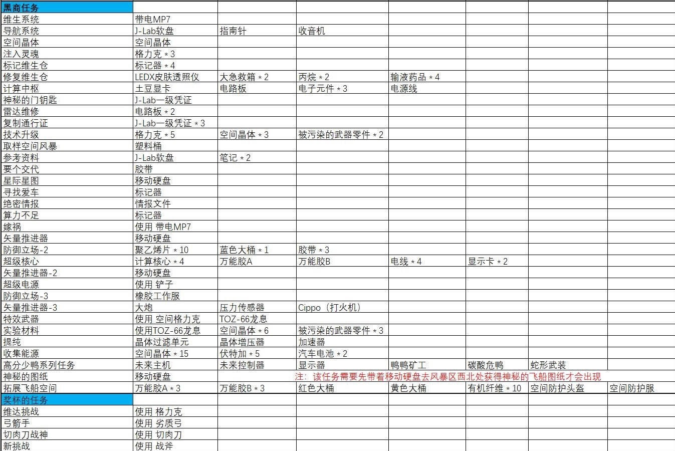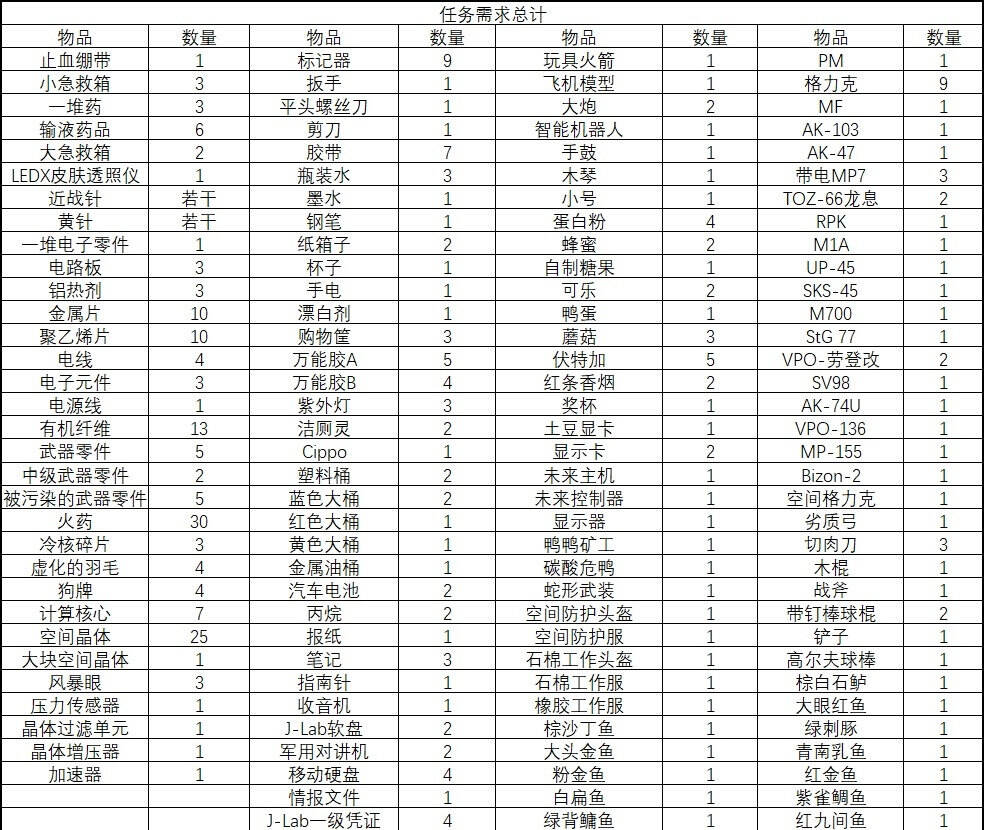 任務(wù)所需物品匯總