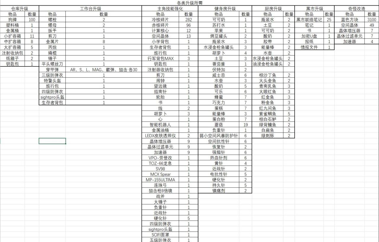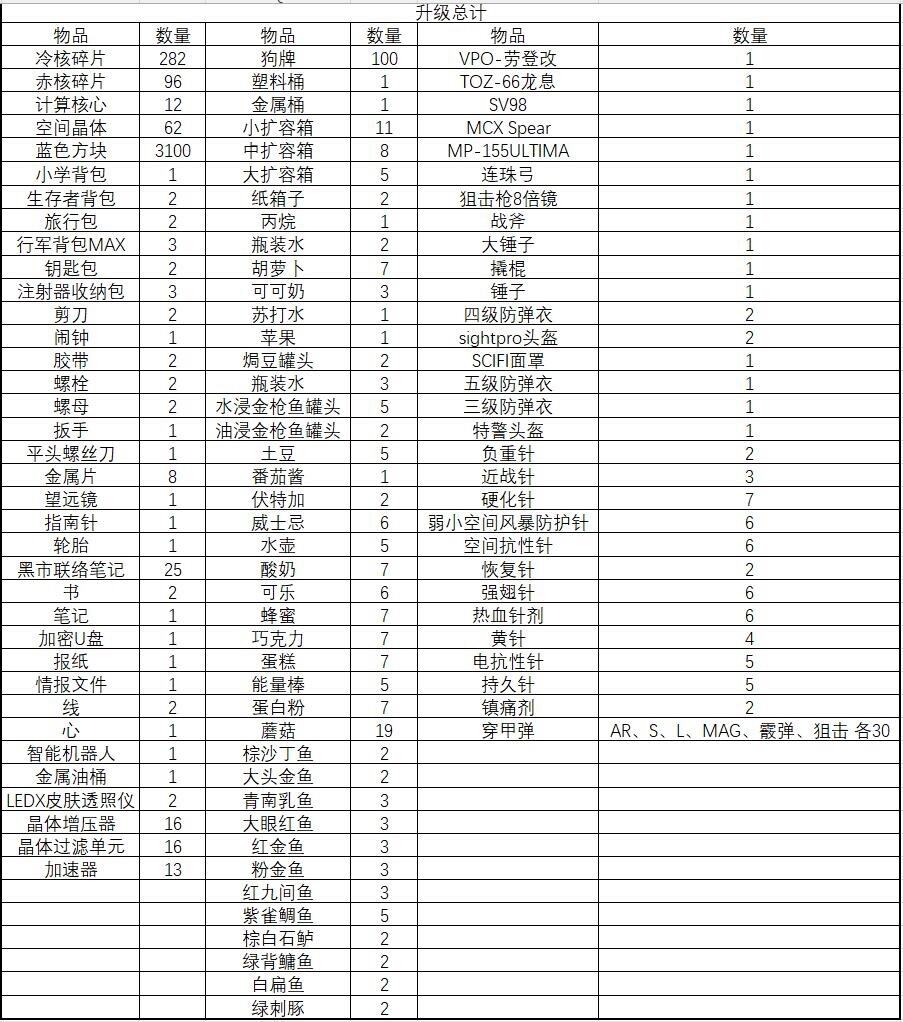 升級(jí)所需物品匯總