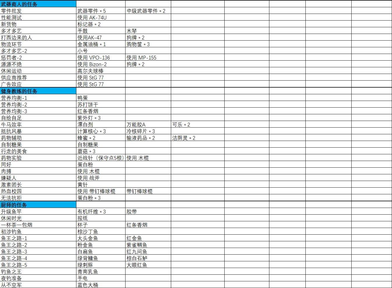 武器商人、健身教練、廚師任務(wù)所需物品
