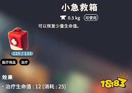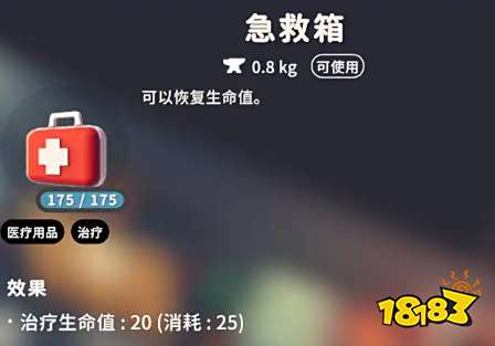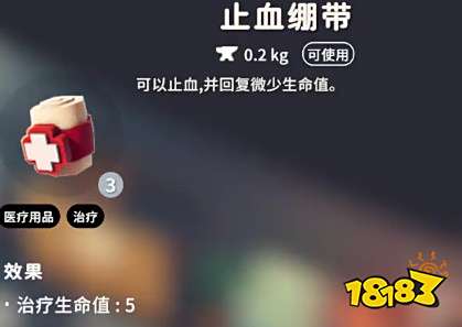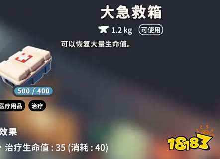 專注于回復血量,沒有扣除水分的懲罰,同時也自帶繃帶解除流血的效果。這小中大三型血包,越靠后,單次使用回復血量越多,同時使用時間也越長,一次解除的流血狀態(tài)分別是1、2、3層。如果條件允許的話,還是用可樂代替大急救箱緊急回血吧