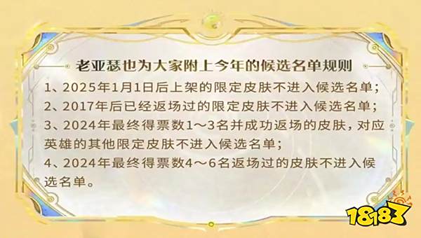 整體規則和去年差不多:最終排名前三的皮膚會直售返場,后三名則是自選返場。投票時間定在 10 月 15 日到 19 日,剛好覆蓋本周末,學生黨也能參與進來投票。