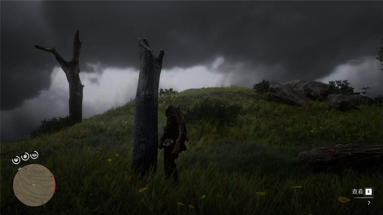 一顆枯樹的樹干中,附近有兩顆倒下的枯樹干。