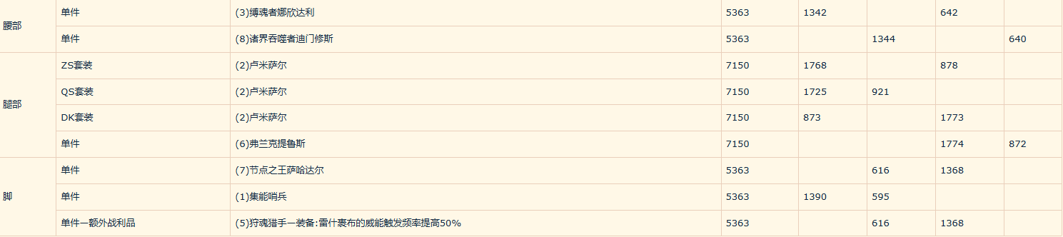 腰部(單件)、腿部(ZS套裝、QS套裝、DK套裝、單件)、腳(單件、單件額外戰(zhàn)利品)