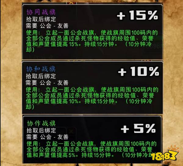 最后,貓哥分享了公會商人提供的三種戰旗:協同、協和、協作戰旗。這三種戰旗只需要公會友善即可購買,分別可以提高100碼內所有公會成員的經驗值、榮譽值和聲望值。其中,協同戰旗提高15%,協和戰旗提高10%,協作戰旗提高5%。這三種戰旗共享2分鐘冷卻時間,然后各自獨立擁有10分鐘的冷卻時間。如果一個小隊一起練級,可以分開插旗,基本上能夠全面提高各種值!