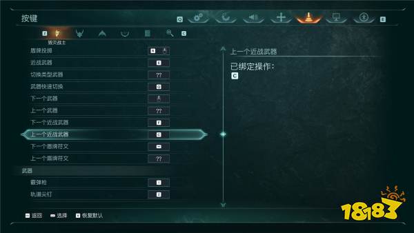 在設置界面中找到”按鍵界面“,之后下滑至下圖位置,找到”下一個近戰武器“與”上一個近戰武器“、”下一個盾牌符文“與”上一個盾牌符文“之后設置順手的鍵位即可。