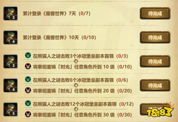 時之礫*4將泰坦重鑄「時光」任意角色升到30級(0/30)/在熊貓人之謎擊敗12個冰冠堡壘副本首領(0/12)