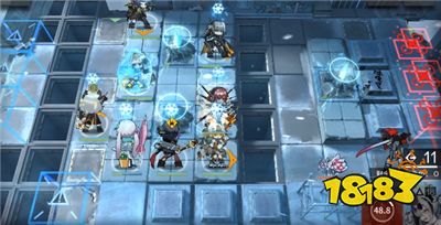 阿消放在富婆貓貓下方兩格向左等等把怪推下去。阿消左下角放個(gè)塞雷婭(這里比較建議放奶盾可以減輕奶媽壓力。)德克薩斯差不多沒了,然后在芙蓉左邊上向上奶的安塞爾。
