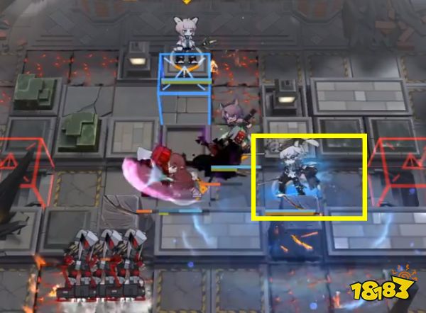 如下圖所示部署霰狙(主力輸出),然后先鋒換奶盾,之前銀灰的位置也上重裝。右上補充單奶(向下)