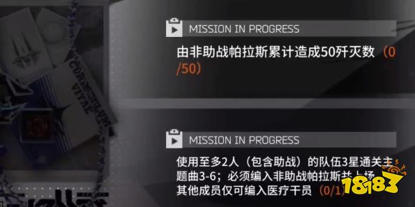 任務(wù)2:使用至多2人(包含助戰(zhàn))的隊(duì)伍3星通關(guān)主題曲3-6;必須編入非助戰(zhàn)帕拉斯并上場(chǎng),其他成員僅可編入醫(yī)療干員。