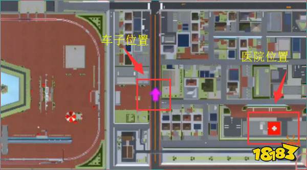3、可以打開地圖看見箭頭的位置就是救護車的位置,醫院的位置就是十字號的位置;