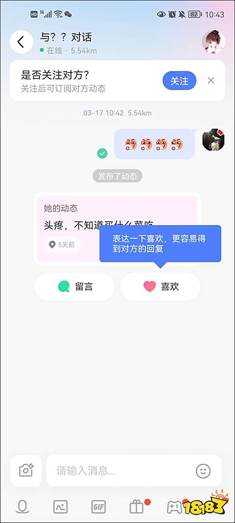 3、在聊天界面中,你可以看到女生是否在線以及與你的距離,也可以對(duì)聊天框進(jìn)行留言,方便女生能夠收到你的心意。