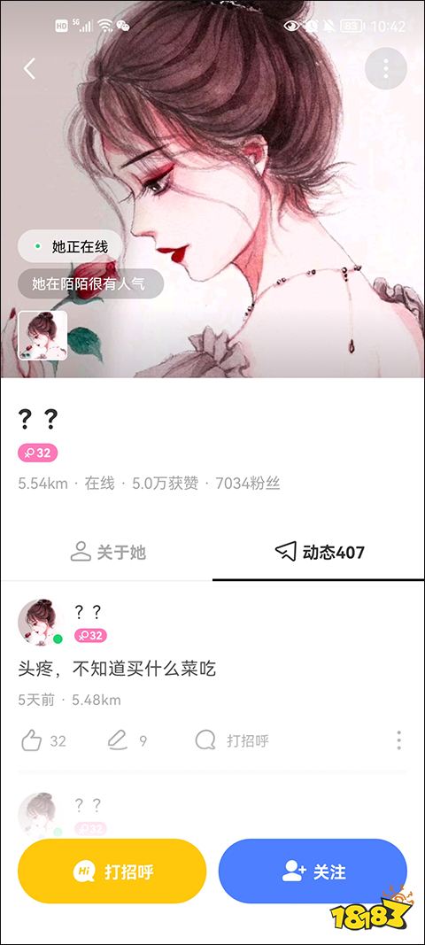 2、看到喜歡的女生你可以點(diǎn)開她的主頁,打招呼,點(diǎn)個(gè)關(guān)注能夠增加女生對(duì)你的聊天態(tài)度哦。