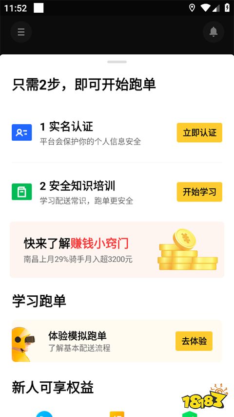 3、選擇玩工作地址后就差兩步就可以跑單了,第一步填寫身份認(rèn)證信息,主要上傳身份證明,第二步則需要你將安全知識(shí)培訓(xùn)學(xué)完。這樣就可以接受跑單了。