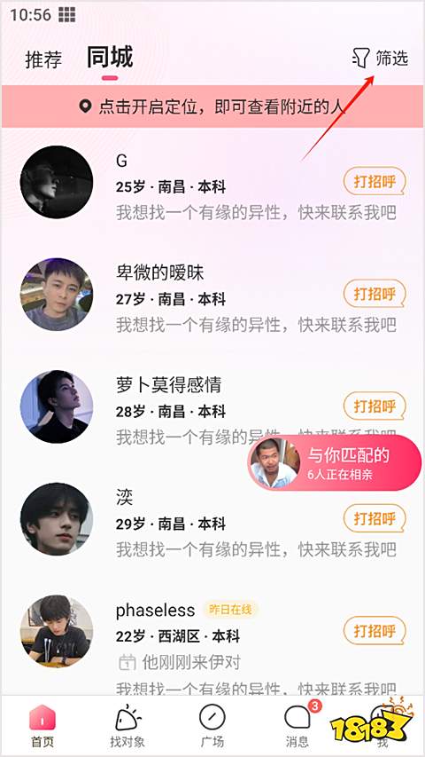 1、首先進(jìn)入軟件,切換到同城選項(xiàng),點(diǎn)擊上方篩選