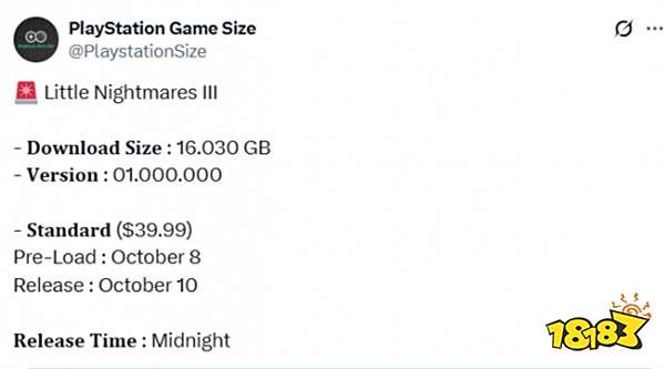 《小小夢魘3》在PS5平臺需要16.030 GB容量大小,版本號 01.000.000。游戲將在10月8日開啟預載,售價39.99美元(約285元人民幣)。