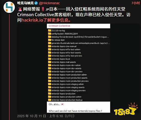 該組織在社交媒體上發布了多個標注“資產庫”“生產預覽”“壓力測試”等名稱的文件夾截圖,配文“誰說我們沒有任天堂主題文件”極具挑釁意味,暗示其可能已掌握大量未公開游戲與商業機密。Crimson Collective此前已有“案底”,曾入侵紅帽公司(Red Hat)與哥倫比亞電信運營商Claro Colombia的服務器,并于今年9月宣稱篡改過任天堂官網。