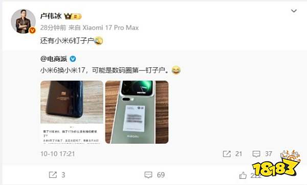 近日,當小米17系列銷量突破百萬臺時,一位堅守八年的小米6用戶終于決定"退役"自己的老戰友。這位用戶坦言:"反應遲鈍了、像素也不行了,換到小米17后簡直絲滑到飛起!"小米總裁盧偉冰轉發了這條消息,配上一個哭笑不得的表情包:"還有小米6釘子戶?"