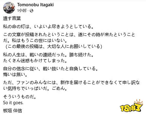 在這篇聲明的開(kāi)頭,他寫(xiě)道:“我的生命之光終于要熄滅了。這篇文章的發(fā)表意味著這個(gè)時(shí)刻終于來(lái)臨。(我已拜托一位親近的人,在我生命走到盡頭時(shí)發(fā)布此文。)”