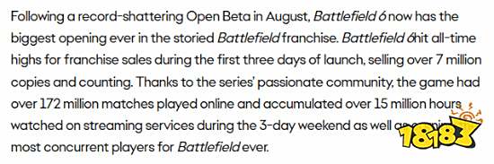10月10日,EA旗下人氣射擊游戲《戰地6》正式發售。僅僅三天時間,該作就以超過700萬份的驚人銷量,刷新了《戰地》系列銷售紀錄,同時創下1.72億場在線對戰、超過1500萬小時的直播觀看時長,以及史上最高的同時在線玩家數。