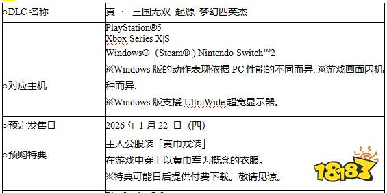 即日起預(yù)購(gòu)DLC,即可獲得主角專用特典服裝“黃巾戎裝”,讓玩家以象征黃巾起義的造型征戰(zhàn)沙場(chǎng)。此外,官方也確認(rèn)Nintendo Switch™2平臺(tái)將于同日發(fā)售《真?三國(guó)無(wú)雙 起源》游戲本篇與《夢(mèng)幻四英杰》DLC。