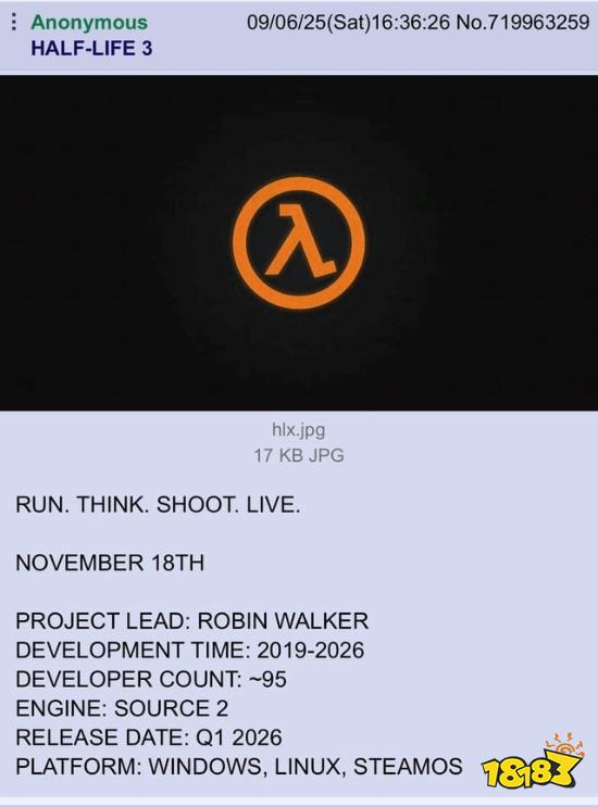 此外,匿名論壇4Chan上今日流出更具體信息,爆料稱游戲將于11月18日正式公布,2026年第一季度發售,采用起源2引擎開發,登陸Windows、Linux和SteamOS。
