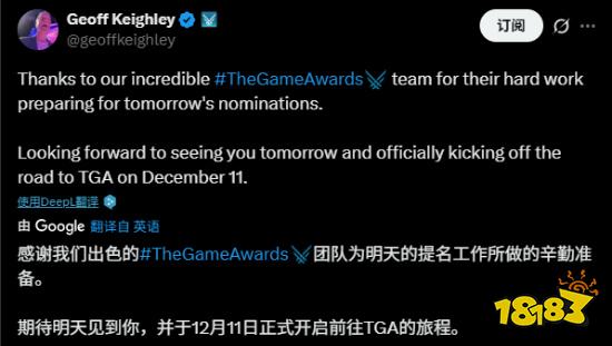 游戲圈的“奧斯卡”TGA明天就公布提名啦!主持人Geoff Keighley剛發文感謝團隊,并確認頒獎禮定于北京時間12月12日上午9點正式開始。不過按照老傳統,從8點半起就會有一大波新游戲預告片輪番轟炸,玩家記得調好鬧鐘!