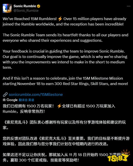 上線剛滿一年的《索尼克Rumble》全球玩家突破1500萬,但官方也直面玩家質疑,強調“付費并不等于贏”。