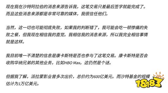 盡管康卡斯特是否參與部分收購、華納是否分拆出售等細節仍存變數,但他指出,沙特PIF目標明確——全盤接手,而派拉蒙曾提出的約600億美元報價在沙特“萬億美元級財力”面前毫無競爭力。