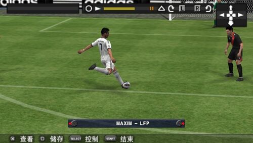 6、大步趟球:高速帶球時,R1+R2+方向鍵↗,↘,↑或↓<急停>放開L按R1 7、急停:松開方向鍵,按R1