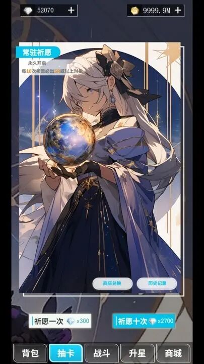 1.抽卡系統:玩家可以通過虛擬貨幣進行抽卡,獲得各類二次元角色。抽卡品質分為R卡(藍色)、SR卡(紫色)和SSR卡(金色)。
