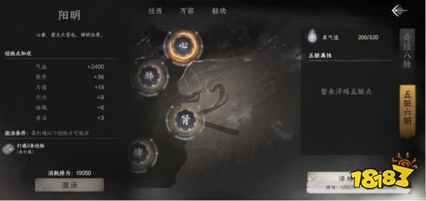 打通八條經脈以后,點擊經脈頁面右邊的“五臟六腑”進入頁面,可以激活五臟六腑。