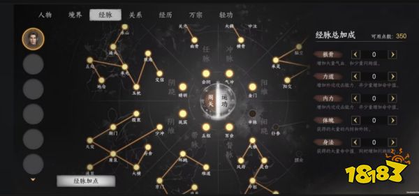 選擇任意一條經脈,從尾部經脈點開始一一激活,每激活一個經脈點,即可獲得5點經脈加成點數,激活中心經脈點可獲得10點經脈加成點數。大俠獲得點數以后,點擊頁面左下角“經脈加點”按鈕,即可自由加點。(可長按分配點數)