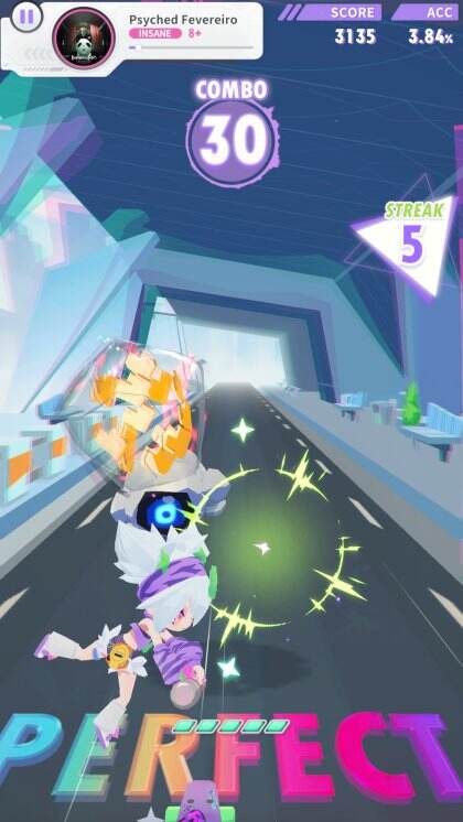 4. 玩家操控角色在充滿未來感與科技風的賽道上疾馳,需根據背景音樂的節奏,精準擊打迎面而來的音符機器人。