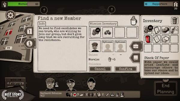 點(diǎn)擊復(fù)制走過至暗時(shí)刻中文版是一款以二戰(zhàn)時(shí)期納粹德國(guó)為背景的策略冒險(xiǎn)游戲,玩家將扮演1933年柏林一個(gè)地下抵抗組織的領(lǐng)袖,招募志同道合的同伴,通過秘密行動(dòng)對(duì)抗法西斯政權(quán)。游戲以獨(dú)特的陰暗畫風(fēng)和真實(shí)歷史事件為基礎(chǔ),帶給玩家沉重而深刻的互動(dòng)體驗(yàn)。