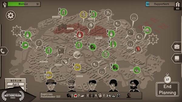 1.回合制策略游戲,分配隊(duì)員執(zhí)行散發(fā)傳單、墻上刷標(biāo)語、搜集情報(bào)等任務(wù)。
