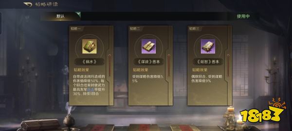 當前版本三國謀定天下的貂蟬,憑借著閉月戰(zhàn)法,確實相當適合擋在前排做肉盾。至少放在這場戰(zhàn)斗中,閉月使得對面的許褚和袁紹都很難打疼她,加上屈人之兵和忘私相助,虎癡的牙都被她掰彎了。貂蟬韜略庫里的三本書,依次研讀了金書禍水、謀戰(zhàn)和延智的善本。本隊伍武力值最高的角色是文丑,故而文丑將獲得閉月的連擊加持。