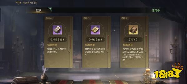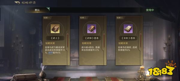 文丑的默認專屬戰(zhàn)法交鋒震威能在普攻后獲得必中狀態(tài),盡管發(fā)動率只有55%,卻具備極其可靠的穩(wěn)定性。在此基礎上跟進的第二戰(zhàn)法臨陣突襲和第三戰(zhàn)法夜襲,都能把文丑的優(yōu)勢發(fā)揮到位。兵道、時利的善本和專屬金書武下構成了文丑的韜略庫,文丑在與顏良成功發(fā)動追擊戰(zhàn)法之后,還能降低自己所受的傷害。就人設來看,文丑總體上還是偏肉盾的,降低對方的統(tǒng)率也是為了給好哥們顏良鋪路。